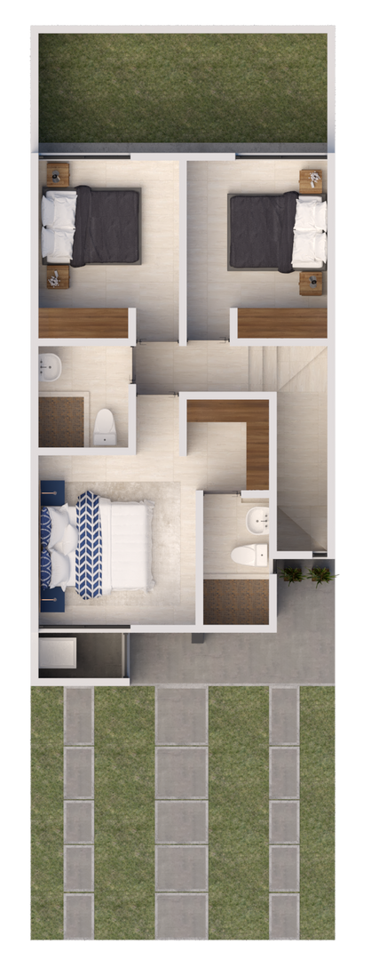 Planta Alta: Habitación principal con vestidor y baño completo, 2 habitaciones secundarias, baño completo.