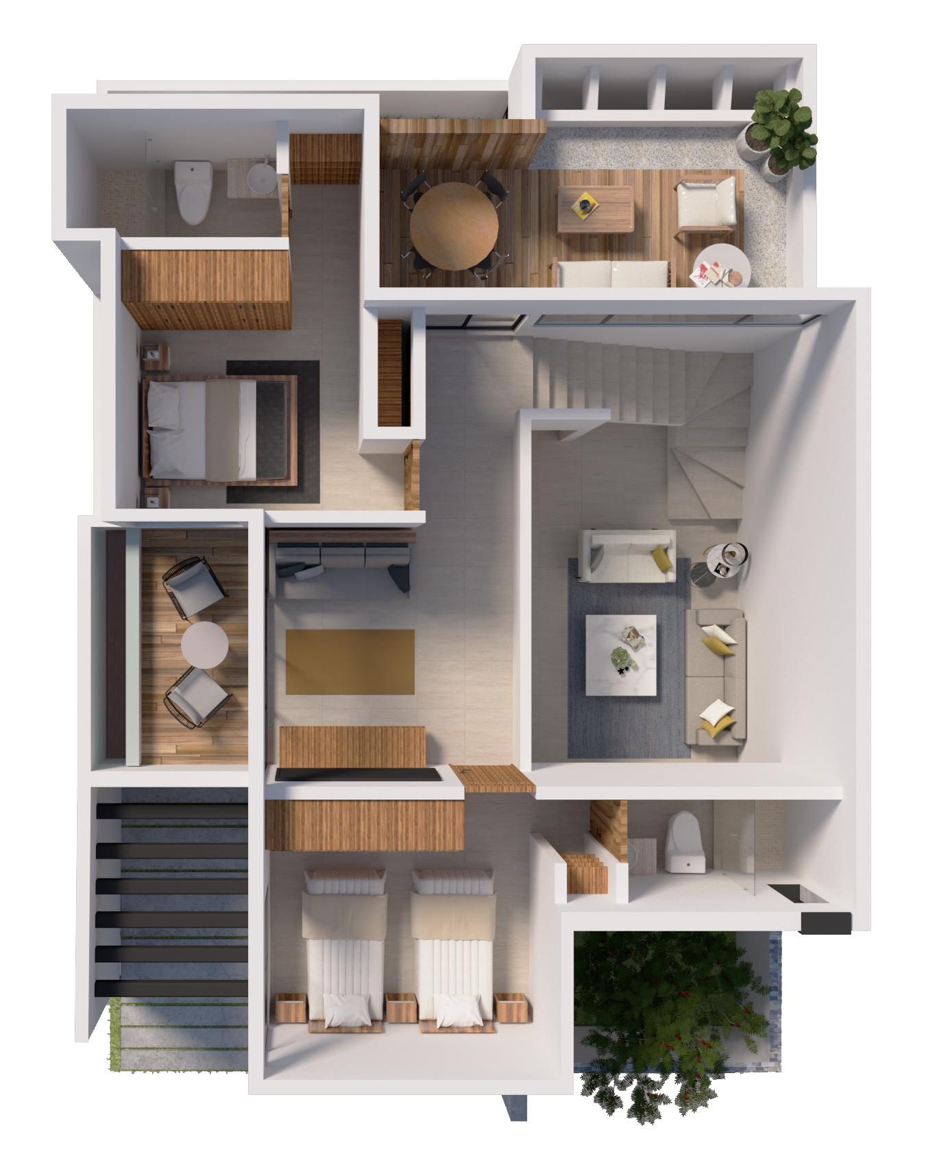 Planta Alta: 2 habitaciones secundarias con baño completo cada una, hall de T.V y 2 terrazas privadas.