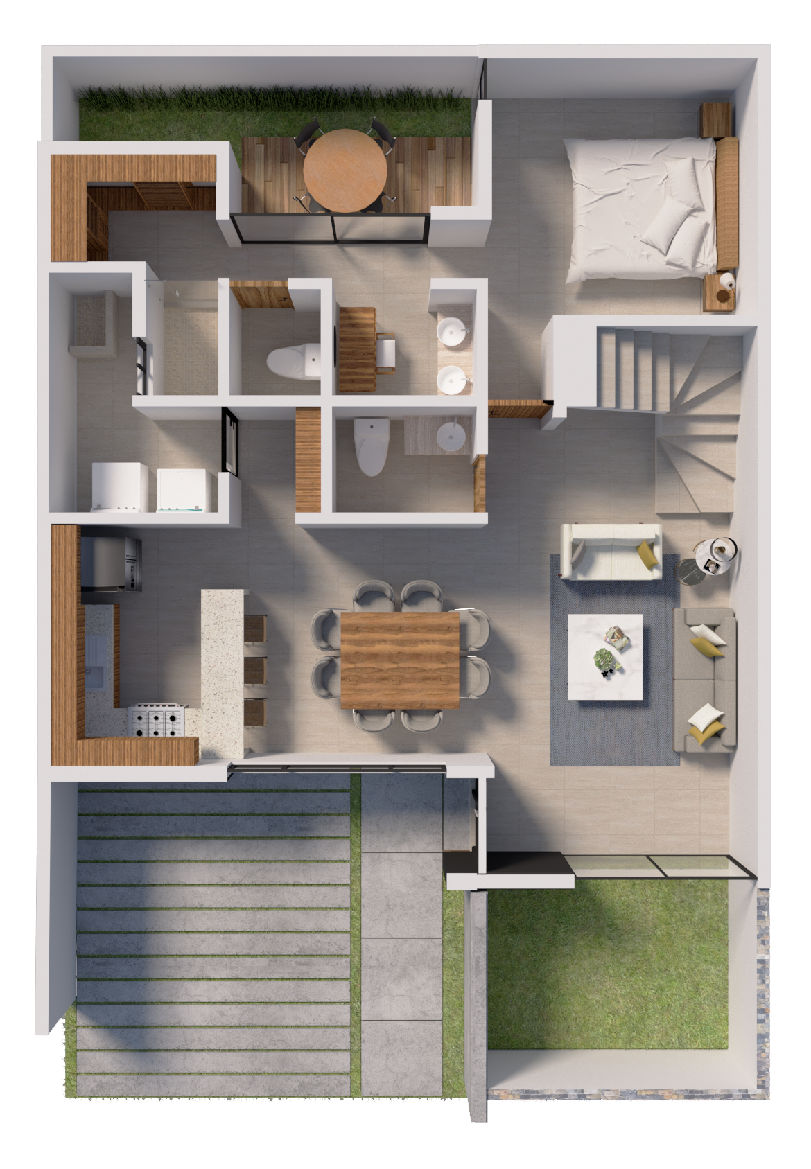 Planta Baja: Sala, comedor, cocina, medio baño, área de lavado, patio frontal y Recámara principal con vestidor, baño completo y patio privado.