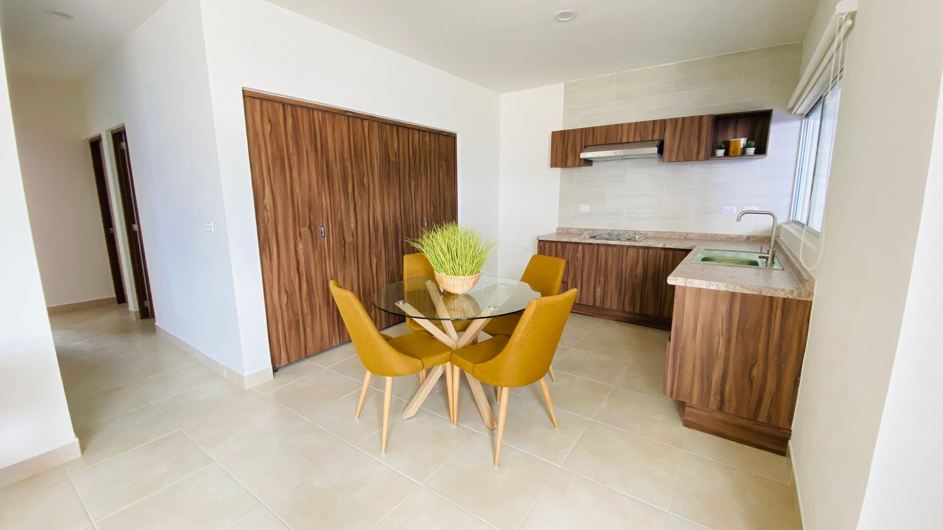 Departamento de 2 recámara, sala, comedor, cocina, 2 baños y área de lavado oculta. 2 cajones de estacionamiento.