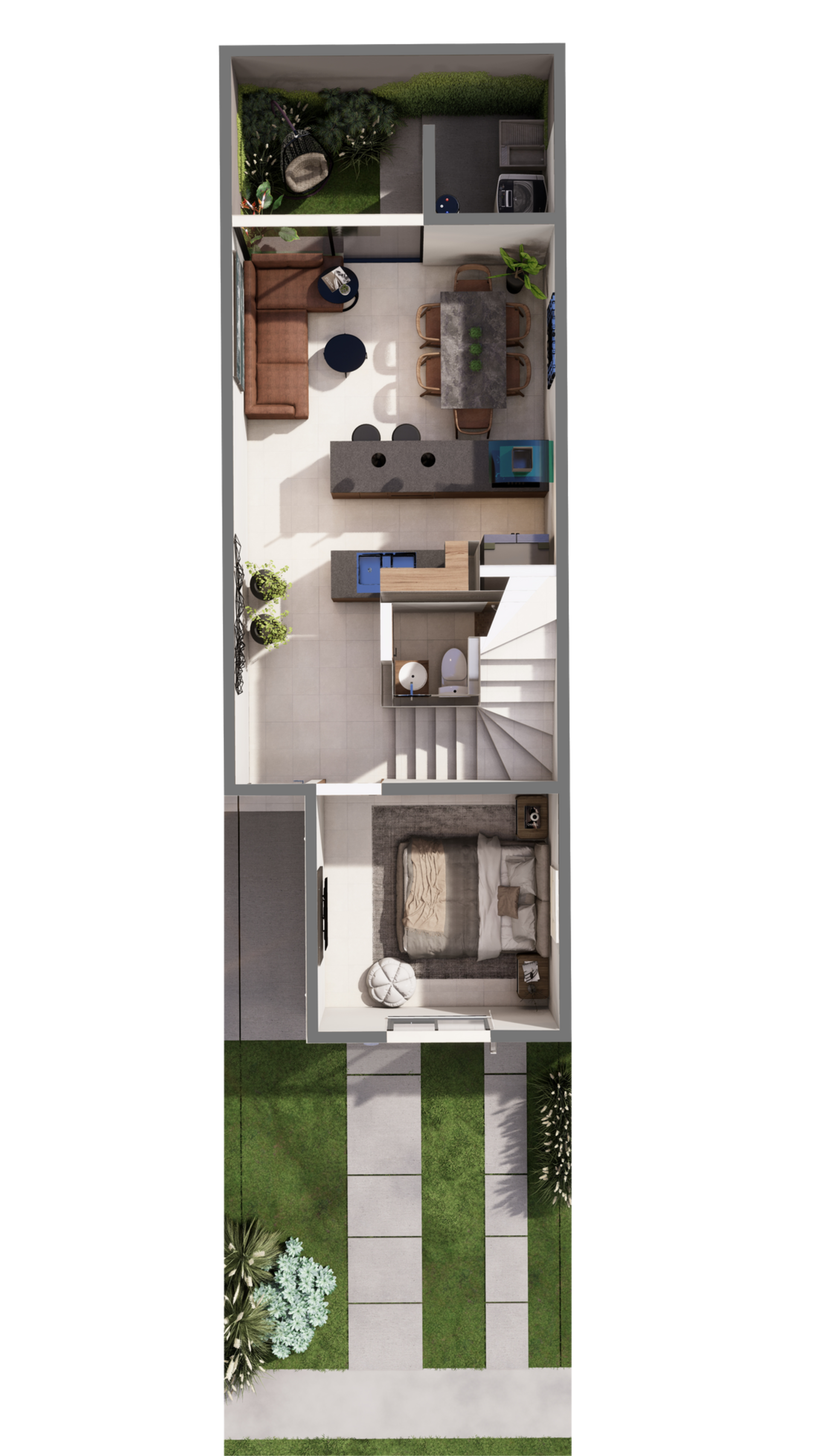 Planta baja con sala, comedor y cocina integrados, 1 recámara, patio de servicio, baño completo, patio trasero y cochera.