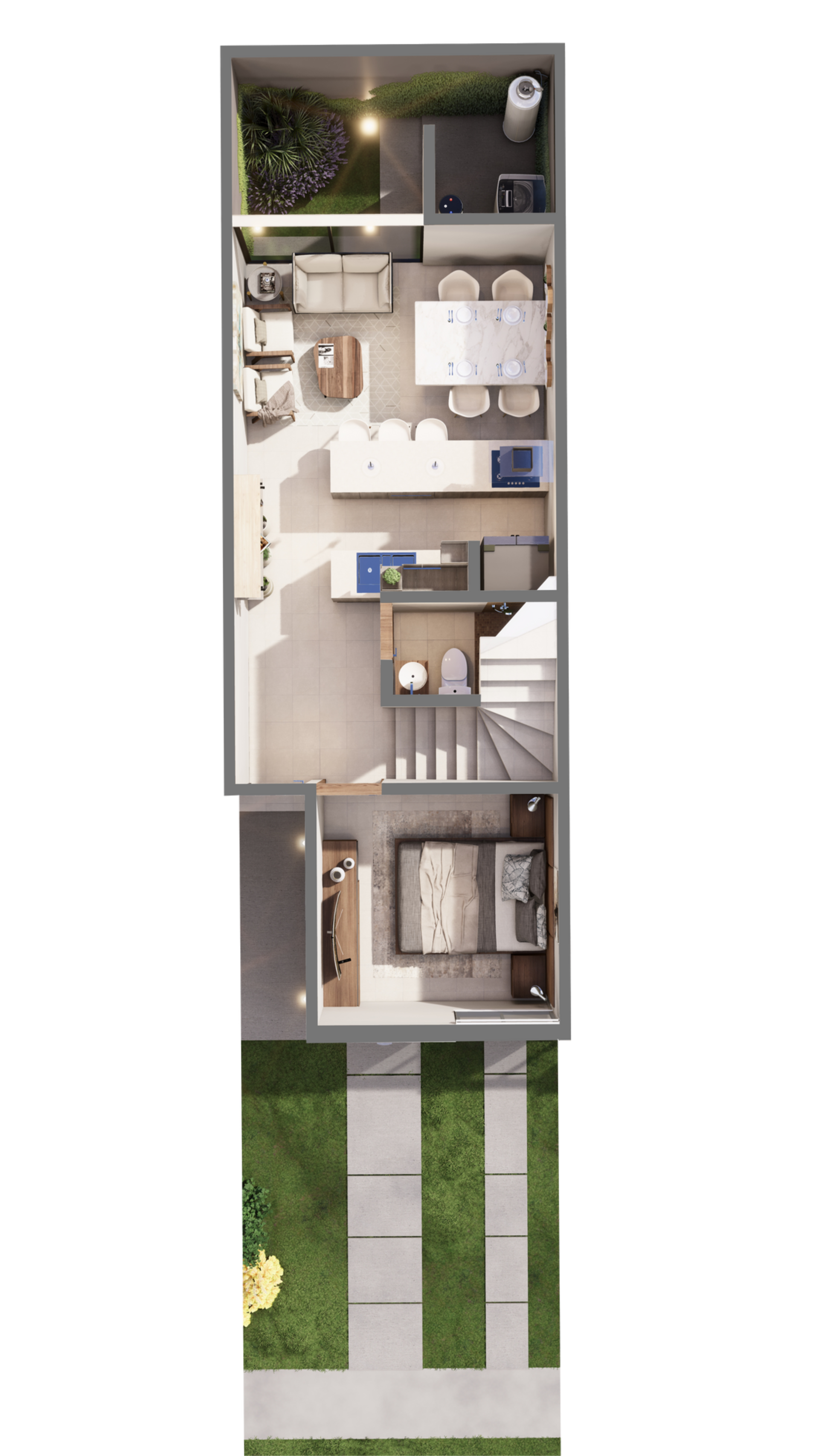 En planta baja encontrarás una cómoda recámara, acogedora sala, moderno comedor y funcional cocina. Además, disfrutarás de una habitación adicional, cuarto de lavado, baño completo, jardín posterior y cochera para un auto.