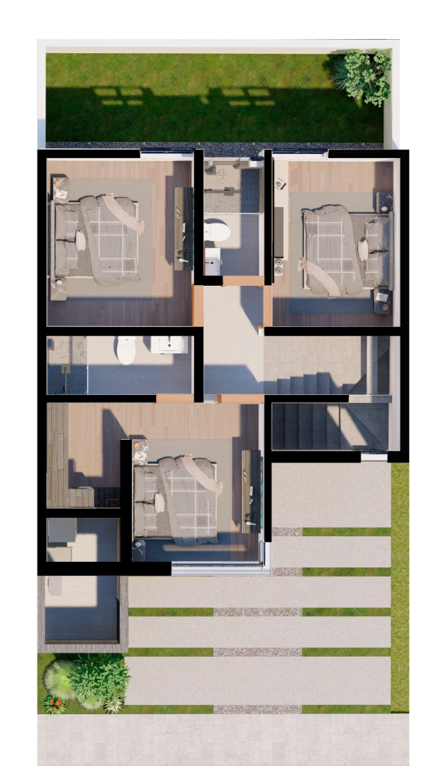 Planta Alta: Habitación principal con vestidor y baño completo, 2 habitaciones secundarias y un baño completo.