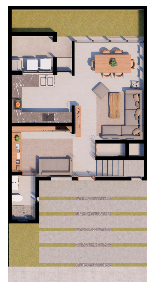 Planta Baja: Sala, comedor, cocina, hall de T.V con baño completo, patio y área de lavado