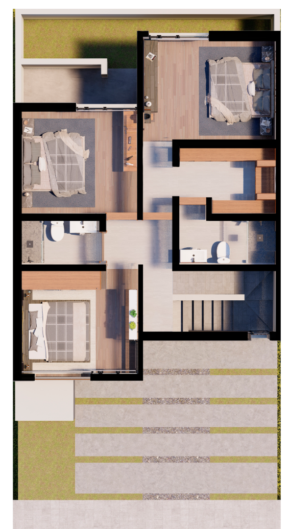 Planta Alta: Habitación principal con vestidor y baño, 2 habitaciones secundarias, un baño completo.