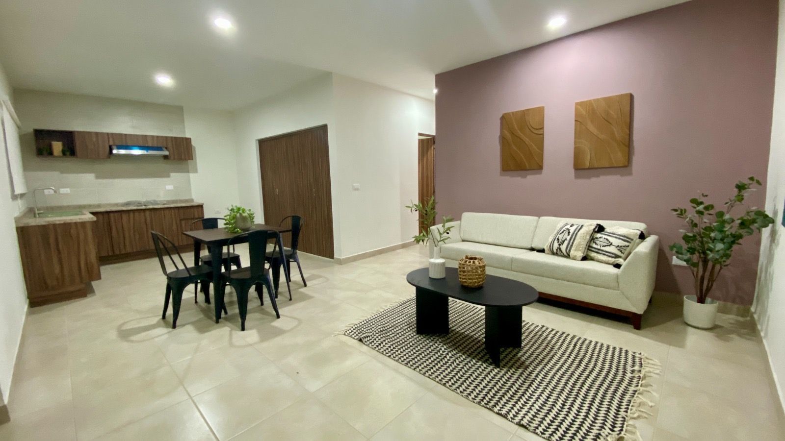 Departamento de 1 recámara, sala, comedor, cocina, 1.5 baños y área de lavado oculta.